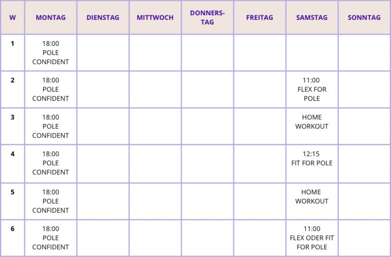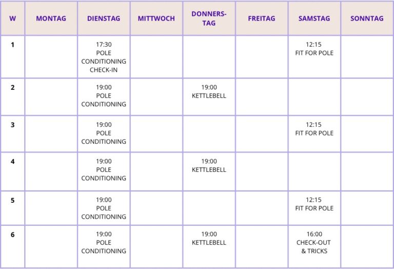 Das Programm ist bewusst so aufgebaut, dass es sich gut in deinen Alltag integrieren lässt. Der Fokus liegt auf einer wöchentlichen Pole-Einheit. Ergänzend gibt es ausgewählte Off-the-Pole-Einheiten sowie optionale Mini-Übungen für zuhause.